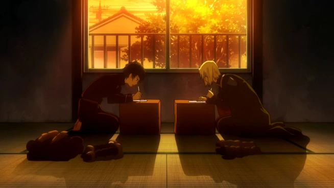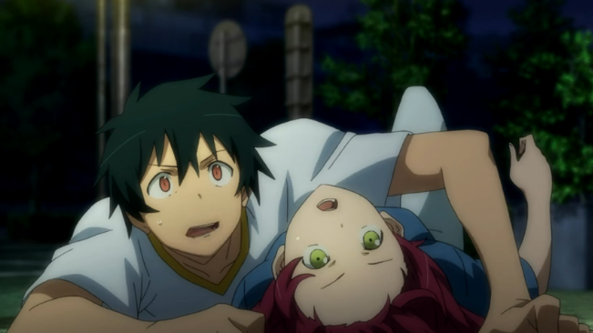 During his meeting with Emi later that night, she questions whether or not he ever plans to return to Ente Isla, mentioning the honest lifestyle he had slowly built and even complimenting his talent in the workplace. She then offers to return home without harming him if he promises to live peacefully on Earth with Alciel, but Maou proclaims that he intends to return to Ente Isla and conquer it for himself. Offput by his answer, the Hero vows she will continue to pursue him until he is dead, but her nemesis remains undaunted by the status quo. He then peddles away on Dullahan, only to get a flat tire and crash. Emi instinctively helps him up and begins to mock him, but the Devil King instead laments the "wound" his bike received, but the duo is interrupted by several gunshots. They flee amidst continued bickering, escaping to a populated, well-lit street. Maou senses the sniper is using magical projectiles and deduces whoever it was must've come from Ente Isla, though he cannot find their attacker. He leaves her with this information before heading back home for the night.