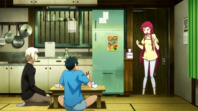 While Maou decides to keep the ordeal a secret from his roommate, the two receive a visit from the Hero the following afternoon, her sudden intrusion causing the Demon King to choke on his lunch. Ashiya locks the doors and windows in a panic, forcing his master to explain her presence. He reluctantly recounts the previous night's events before telling him to open to door to silence Emilia's crying. After insulting their living conditions, the Hero claims she lives better despite being alone, leading Maou to question whether she has any friends. He then learns from her that the Archbishop Olba Meyer failed to reach the Gate in time, thus why she was all alone in Japan. Maou sees her new smartphone and sadly compares it to his basic model before admitting defeat, clearly puzzled that someone so young could live more comfortably than him, despite their remarkably similar conditions. He welcomes her to the "new Devil's Castle" before pronouncing his desire to become a full-time employee and amass wealth and power, though she dismisses his goals as stupid. Emilia admits she can't kill him and return to Ente Isla, claiming she will do so once she amasses enough power to complete both tasks. She then introduces herself as "Emi Yusa" and insults Satan's choice of a human name, slamming the door behind her as she leaves.